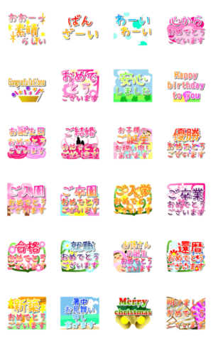 24種類の動くお祝いメッセージスタンプです。合格、卒業、入学、誕生日や赤ちゃん誕生、還暦、お孫さん誕生などなど、敬語を使ったものを用意しました。