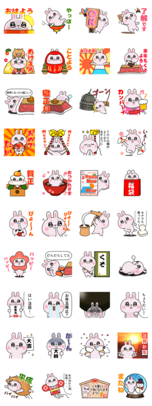 年末年始に使える煽りたいうさぎラピピのスタンプ。 2019年の干支の猪入り。あちゅ より発売