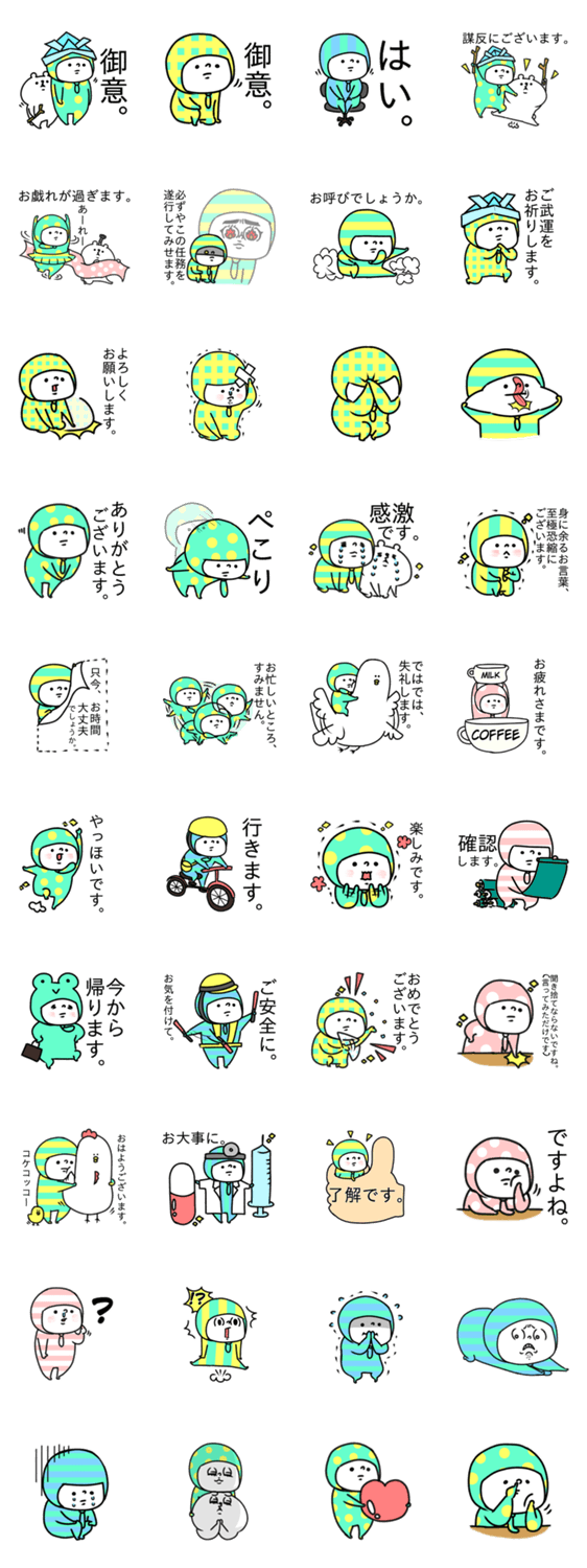スタンプ説明文 忍者っぽい奴です。そして、第七弾です。毎度お馴染み「クマっぽい子。」が紛れ込んでいます。敬語っぽいです。