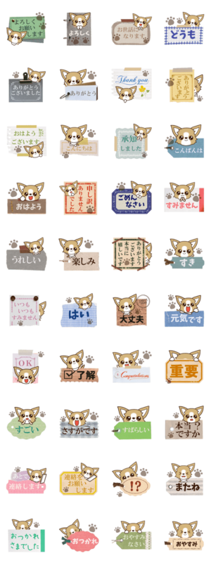 小さくてかわいいチワワ。メモ風にしていて、使いやすい言葉を集めました。犬好きな方、チワワを飼っている方にぜひ使っていただきたいスタンプです。足跡は透けています。かたこ より発売