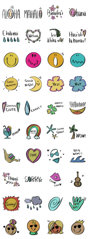 ハワイアンサマーを感じるカラフルで使いやすくかわいいスタンプ!夏先取りでトークルームを賑やかにしよう!サーフや西海岸好きにも!ハワイ語、英語、絵文字があるよ!YUURI KANNO より発売