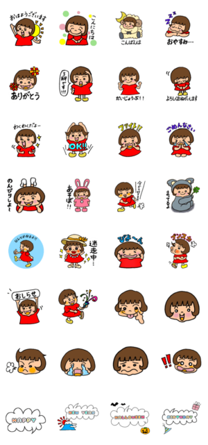 赤いワンピースを着たおかっぱボブの女の子です。 時々 着ぐるみ。 日常会話で使えるものを集めました。