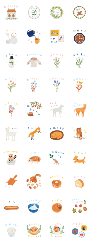 優しい言葉でメッセージを送れるスタンプです。草花やお菓子、動物など、心あたたまるイラストを丁寧に描きました。濱 佳江 より発売