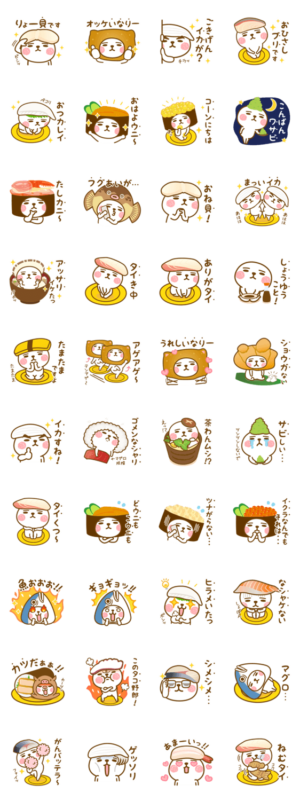 しろくてまんまるなきゃら『モチモチもちまるん』が今度は『お寿司』になってみたよ。寿司ネタにちなんだダジャレも盛りだくさんだよ!