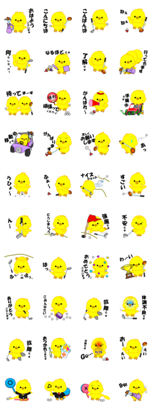 ゴルフをするひよこ(ヒヨコ)で会話するスタンプです。練習やトーナメント、ゴルフコンペや日常会話に使えるスタンプです。makunouchi より発売