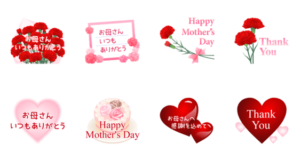 母の日のアニメーションスタンプです。カーネーションやケーキやハートに感謝の思いを込めて。吉田 暁 より発売