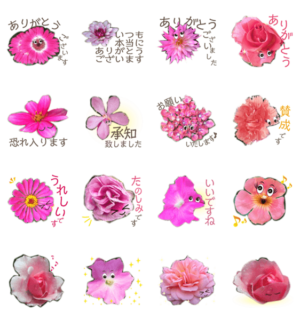 バラ、カーネーション、ガーベラ等ピンク系の花のスタンプです。なんともキュートな花達のメッセージ!日常会話にお役立てください。