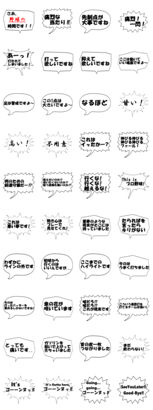 プロ野球実況でよく使われるフレーズから名実況までをスタンプにしてみました。PRO6 より発売