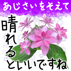 雨の季節に使いやすい丁寧な手書きの言葉に白、ピンク、薄紫、青等のアジサイの花を添えました。挨拶や目上の人にも使える敬語をあじさいの美しい花びらで彩っています。