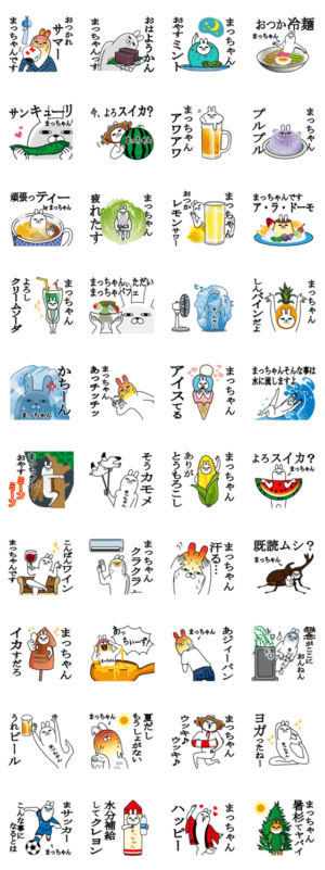 まっちゃんが使う名前スタンプダジャレ夏編。まち,まゆみ,まさと,まこと,松本,松田,松井,松坂,松崎,松村,松岡,松山,松下,松浦,松尾,松原,松島などまっちゃん専用スタンプ