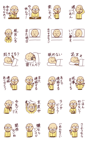 チェックのシャツを着た男のスタンプ。 ハゲ・スキンヘッド×ヒゲ×メガネのおじさん。GS beans より発売