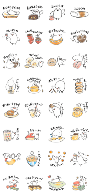 日常会話の中においしいものと文鳥さんを添えた、毎日使える文鳥さんスタンプです。ゆひろ より発売