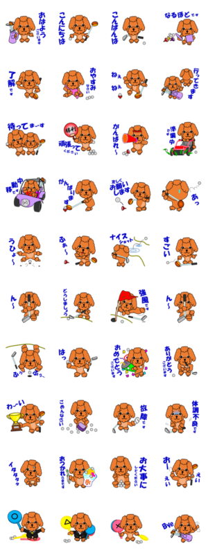 ゴルフをする茶色のトイプードルで会話するスタンプです。練習やトーナメント、ゴルフコンペや日常会話に使えるスタンプです。makunouchi より発売