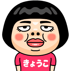 きょうこ(キョウコ)はとってもブスな女の子。自分の名前入りピンクTシャツを着るちょっと痛い子。自虐的だけどおはようからおやすみまで使える万能な名前スタンプです。
