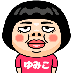 ゆみこ(ユミコ)はとってもブスな女の子。自分の名前入りピンクTシャツを着るちょっと痛い子。自虐的だけどおはようからおやすみまで使える万能な名前スタンプです。