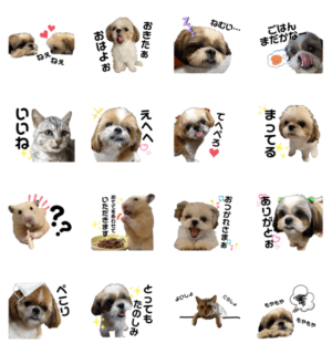 シーズーのルークくんともこちゃんのスタンプ。お友達のミルキーやもぐりん、猫のいぶちゃんや、ハムスターのもちくんも登場★rippy より発売