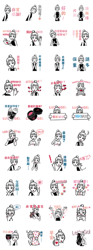 ジェルネイルブランド「LUCU♥GEL(ルクジェル)」のキャラクタースタンプ(中国語-繁体字版)です。 ネイルサロン用「接客会話」と「日常会話」の2タイプ使えます。