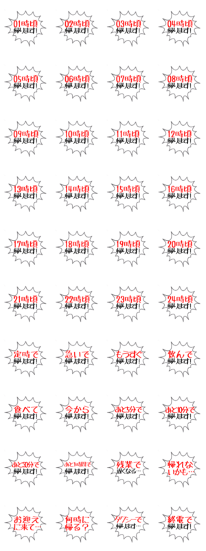 帰る時間を連絡する用のスタンプです。文字を打たずに「今から帰る」「定時で帰る」「●●時に帰る」など「帰ります」に便利です。