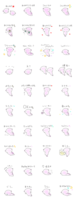 ウーパールーパーの毎日使いやすい日常会話、敬語のシンプルな絵文字です。Punipuni より発売