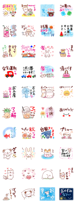 夏のおわりから、秋へ向かうスタンプセットです。夏の思い出・残暑見舞い・秋の始まり・まだまだ暑いけれど、涼しくなるまでもうひと息♪