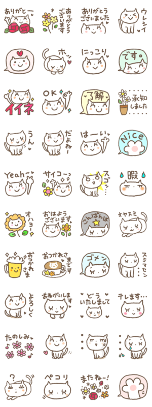 シンプルな白猫のデカ文字スタンプ。挨拶、あいづち、感謝の気持ちなど、よく使う気持ち伝わる40個です。