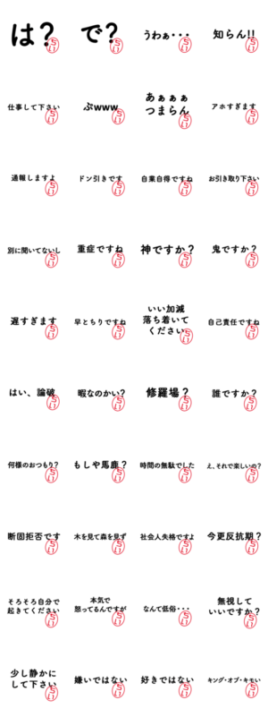 ちい専用ハンコ(判子)が相手を煽る毒舌言葉にポチッと押してあるスタンプ。イッレ・コスヤ より発売