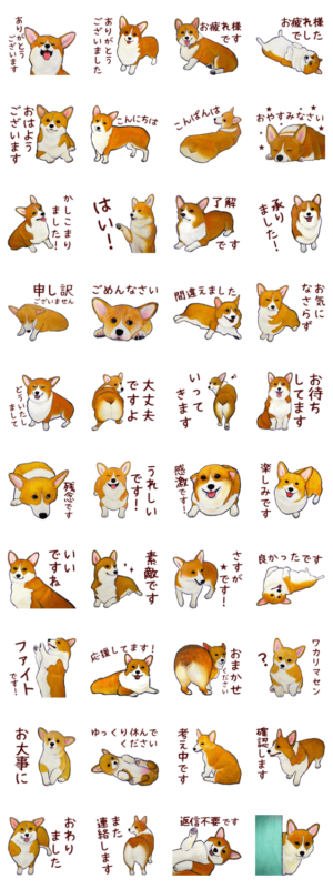 コーギーが会話をお手伝いします。使いやすい敬語スタンプ。ao より発売