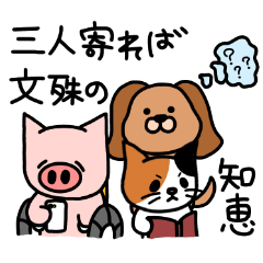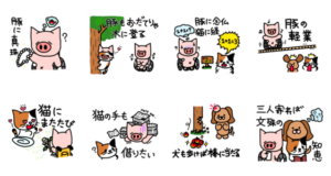 くるまいすに乗ってるぶたのぶーさん。ちょっとシュールなぶーさんと今回は、にゃーさん。たろう。のお友達も登場。ことわざバージョン。