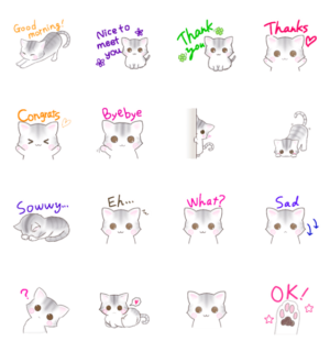 ふんわりかわいいサバトラ猫ちゃんのスタンプです。英語バージョンです。Hitomi より発売