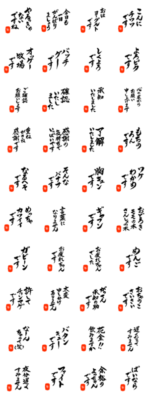 斧さん用死語入り筆文字のスタンプ。敬語丁寧語で仕事でもバンバン使える。判子(はんこ)付きで見た目も鮮やか!イッレ・コスヤ より発売