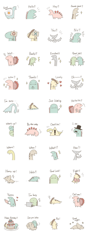 ゆるい恐竜たちの英語版スタンプです。簡単でわかりやすい英語を集めました。恐竜シリーズ第16弾!