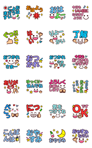 毎日使える基本セット!大人スマイル挨拶!おしゃれハート,星入り♪日常会話よく使う言葉シンプルめ大きめデカでか文字!かわいく動く親しみやすい表情の無難な顔文字シリーズ