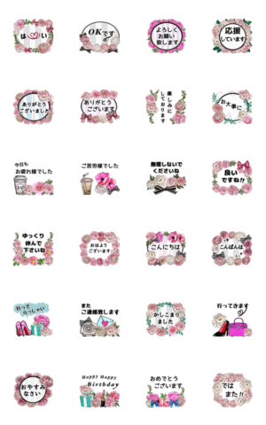 可愛い過ぎないピンクのバラなどの動くお花の敬語スタンプです。オシャレなお花やキラキラが似合う美人な奥様ママお嬢様、お姉さん女子たちにオススメスタンプです。