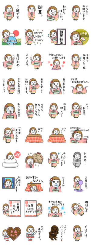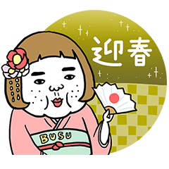 憎めないブスの年末年始ver.です。新年,年末年始,大晦日,お正月,バレンタイン等、冬のイベント用年賀スタンプ!ブサイクだけど愛嬌がある自虐ネタスタンプ!毎年使えるよ!キャロライン企画 より発売