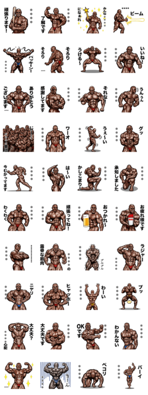 ボディビルのポージングなどを使った、日常会話で使える 筋肉好きの為の、筋肉 マッチョ マッスル スタンプのカスタムバージョンです。