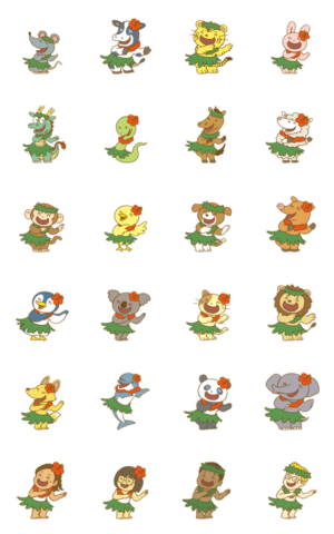 十二支を含む動物がフラダンスを踊るかわいいスタンプ。フラダンスが好きな人、お正月をハワイで過ごす人の新年のあいさつなどに。おまけに人間のスタンプもあります。
