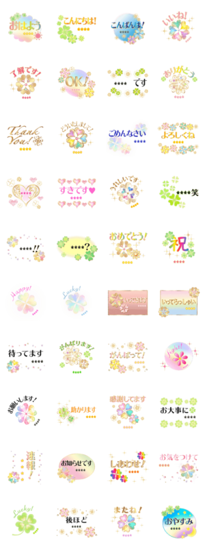 運気が上がる幸運モチーフのクローバーや虹色カラーが大人カワイイカスタムスタンプが登場!友達や家族の名前を入れて自由に使ってください。購入後もテキスト変更可能です