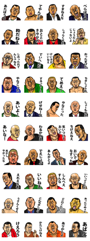 ヤクザみたいなヤンキーのような、顔は恐いが、心優しく男気溢れる、そんな江戸っ子のスタンプです。東京都の下町の方言、江戸弁、江戸っ子弁を喋る強面の面々をご堪能あれBrody Machine より発売