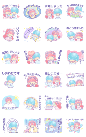 ふわふわなコットンキャンディとプードルと一緒に、キキ&ララがよく使う言葉をかわいくお届け!文字が大きめで見やすい敬語スタンプだよ♪SANRIO より発売