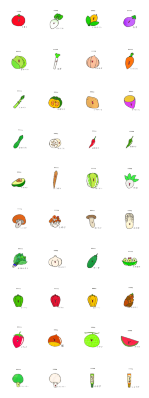 みなさんが文字を入れて完成するスタンプです!!お気に入りのおやさいたちに、好きな言葉を入れましょう♪【例:ありがとう、大好き、お疲れ】制限は12文字までですよ〜!