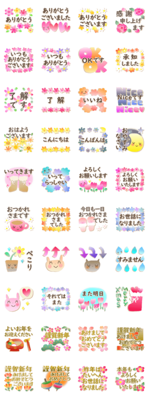 文字が大きくて見やすい、大人かわいい40個。シンプルなよく使う言葉だけの、ふんわり優しい気持ち伝わるスタンプです。クリスマスや年末年始のご挨拶、年賀状も充実です。Konko3 より発売