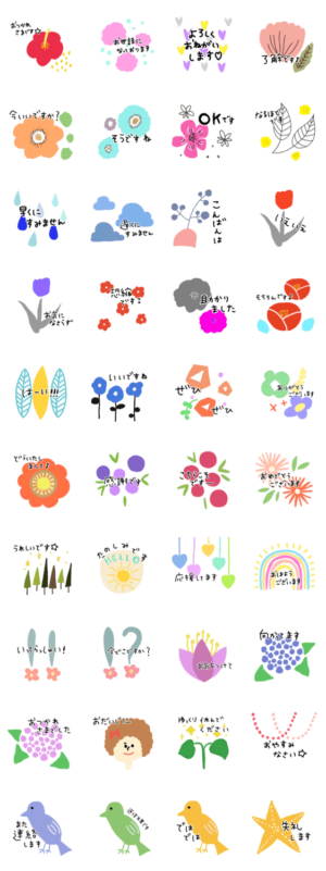 お花や鳥、星、ハート可愛いミックススタンプ☆北欧っぽく、優しい色合いにしたよ♫絵文字もあるよ♡pocaのお絵描き 大人敬語、やりとりにどうぞ♫