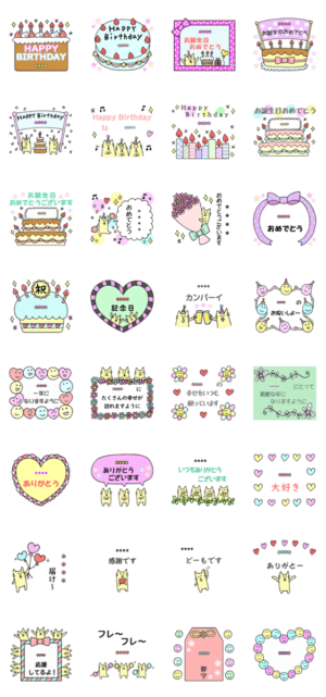 誕生日、おめでとう、ありがとうのセットです。 名前、年齢、好きな言葉を入れて楽しんでね。 ネコなどがお祝いしています。 祝福、応援、メッセージ、敬語もあります。eko より発売