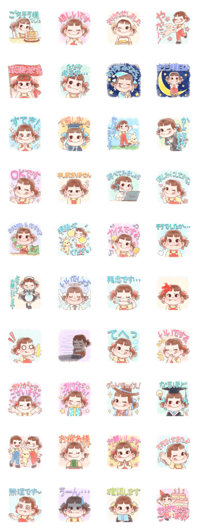 ペコちゃんの愛くるしいスタンプに癒されて下さい。送られて来たら思わず笑みがこぼれるはずです。