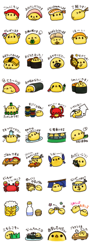 まるまるころころしたひよこさんのスタンプです♪ 大好きなお寿司に変身したり、魚介たちと仲良く喋ったりします。kotone. より発売