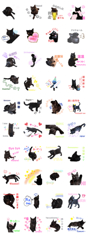 冬の寒いひと時を黒色の子猫スタンプでお楽しみください。 ローマ字でも表現を表示しました。日本語勉強の海外の方にもつかってもらえたらうれしいです。