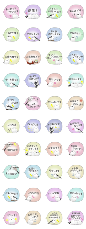 リアルなシマエナガのスタンプ、敬語で挨拶編です♪日常でよく使われる敬語をまとめました♪この他、シマエナガシリーズでスタンプや絵文字もあります^^