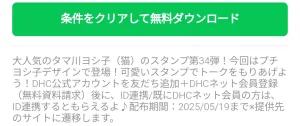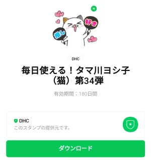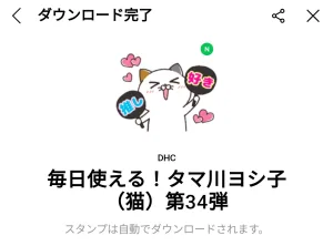 4月22日に出た無料スタンプ、「DHC」の「毎日使える!タマ川ヨシ子(猫)第34弾」をダウンロード方法やこの無料スタンプを実際にゲットしてトークに使う方法を解説しています