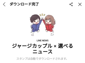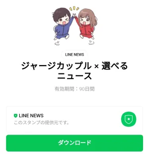4月23日に出た無料スタンプ、「LINE NEWS」の「ジャージカップル × 選べるニュース」をダウンロード方法やこの無料スタンプを実際にゲットしてトークに使う方法を解説しています