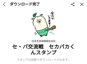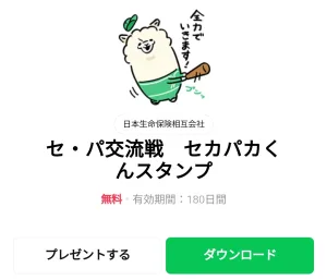 5月7日に出た無料スタンプ、「日本生命保険相互会社」の「セ・パ交流戦 セカパカくんスタンプ」をダウンロード方法やこの無料スタンプを実際にゲットしてトークに使う方法を解説しています